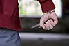 Nærbilde av person som sitter ved en pc og holder en pakke fra Temu i hendene