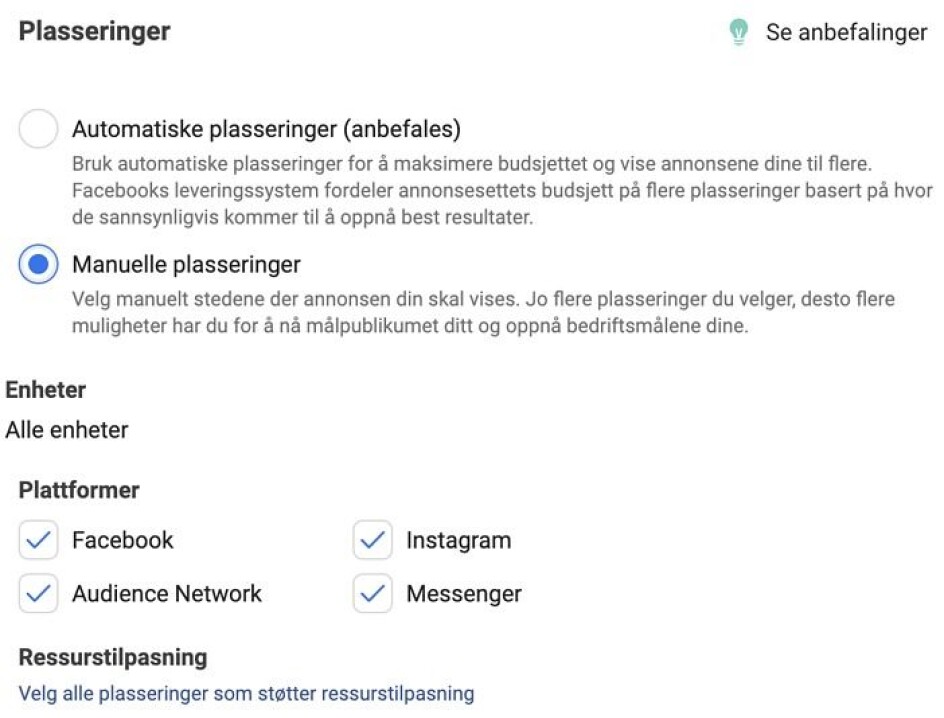 Som du ser har du mange flere valg i ‘Business Manager’ for hvor annonsen din skal vises. Det vil alltid være positivt for deg å ha mer kontroll og oversikt over hvor dine annonser vises. Hvis du for eksempel mistenker at dine kunder foretrekker ‘Stories’ over ‘Søk’ vil det være hensiktsmessig å kunne prioritere annonser i den kanalen.